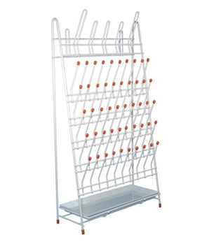 Afdruiprek van PE-gecoat staaldraad. Kan aan de muur bevestigd of op tafel geplaatst worden. Voor 50 buizen en 5 kolven. Met opvangbak en pootjes met plastic doppen.