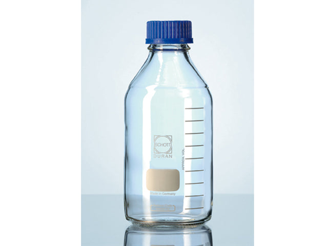 Glazen Duran laboratoriumfles. Met graduatie en schrijfvlak. Voorzien van charge-identificatienummer. Compleet gemonteerd met schenkring en blauwe polypropyleen schroefdop.