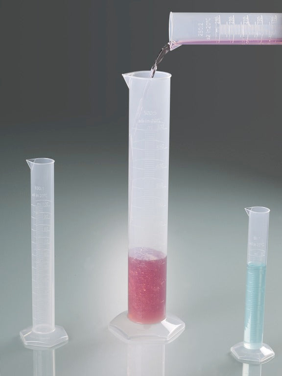 Measuring cylinder, tall shape, according to DIN 12 680(Glass)/ISO 6706, with hexagonal base. For use in laboratories, chemists, in workshops, during outdoor field work and wherever volumetric measurements have to be made during production.