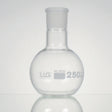 Met vlakke bodem en standaard geslepen verbinding. Witte schaalverdeling en opschrift. Volgens DIN EN ISO 4797.