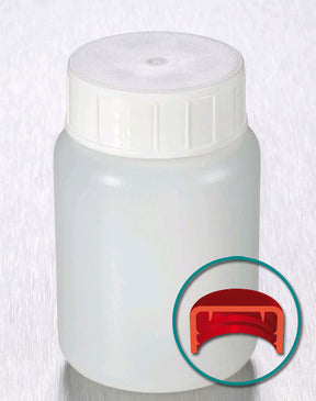 Ronde monsterpot van polyethyleen met witte schroefdeksel en inlegstop.