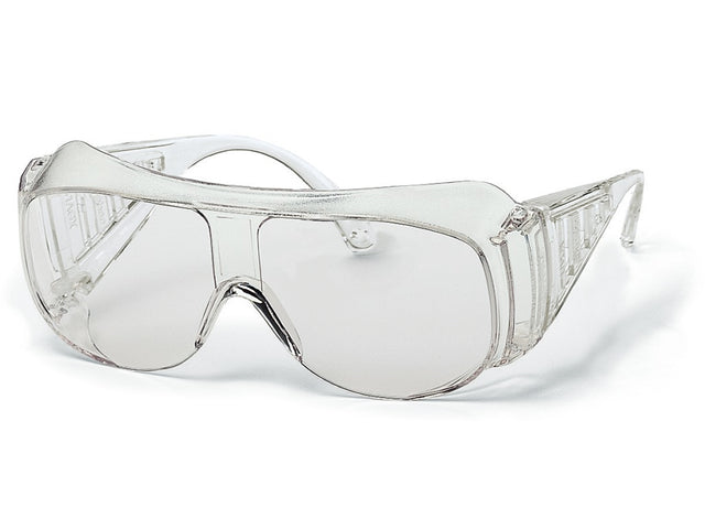 Very comfortable over-goggles with unrestricted side view, suitable to go over most glasses. 180° field of vision, lateral ventilation through the side shields. Without coating. With Polycarbonate side pieces. According to DIN EN 166 -168 and 170.